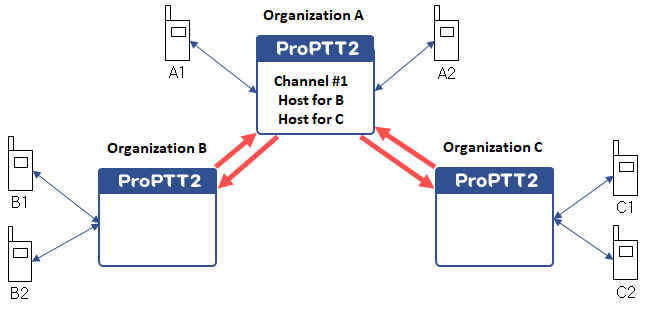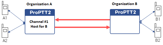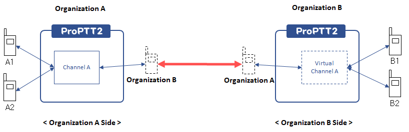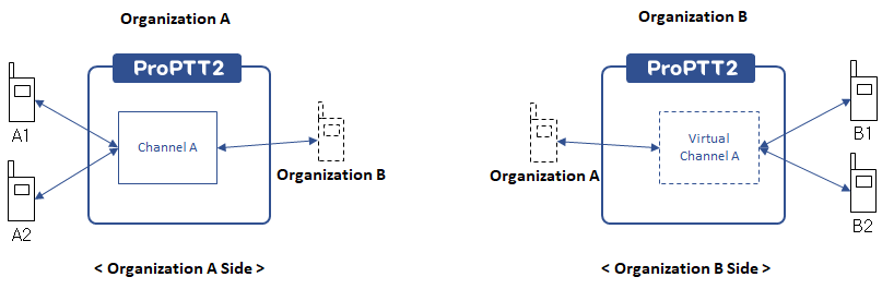 When user B1 send a PTT to the vitual channel A, user A1 and A2 can receive the PTT from the user "Organization B" in the channel A.